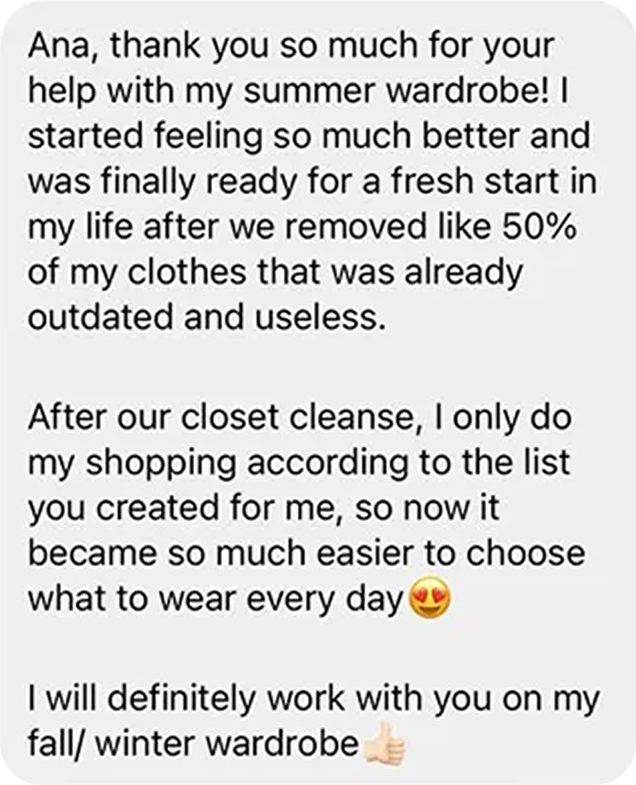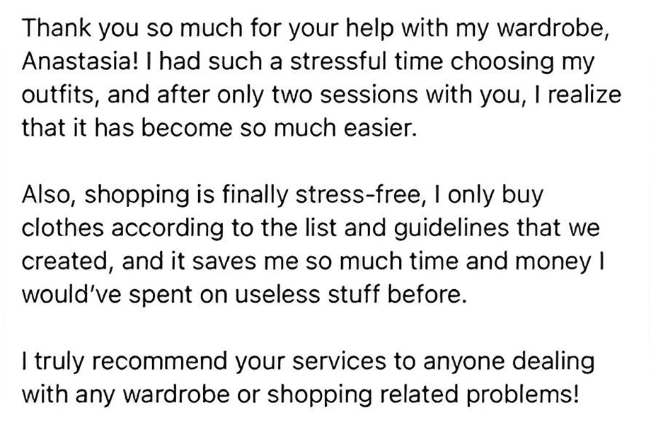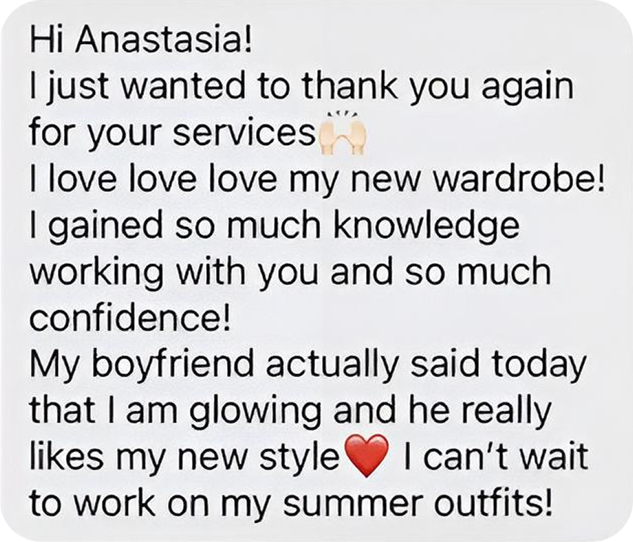 I’m Anastasia, a personal wardrobe stylist based in Los Angeles. I help clients build wardrobes that actually work — so getting dressed becomes simple, effortless, and polished.